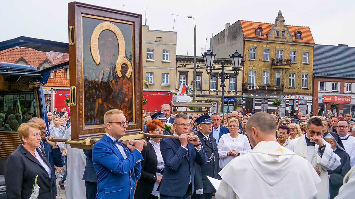 Proboszcz ks. Krzysztof Tarbicki i senior ks. kan. Jerzy Nowak przekazali Obraz Matki Bożej delegacji radnych miejskich oraz burmistrzowi Dariuszowi Chudzińskiemu. Orszak w postaci banderii konnej, rowerzystów, eskorty policyjno-strażackiej oraz wiernych ruszył w stronę kościoła na uroczystą mszę świętą.