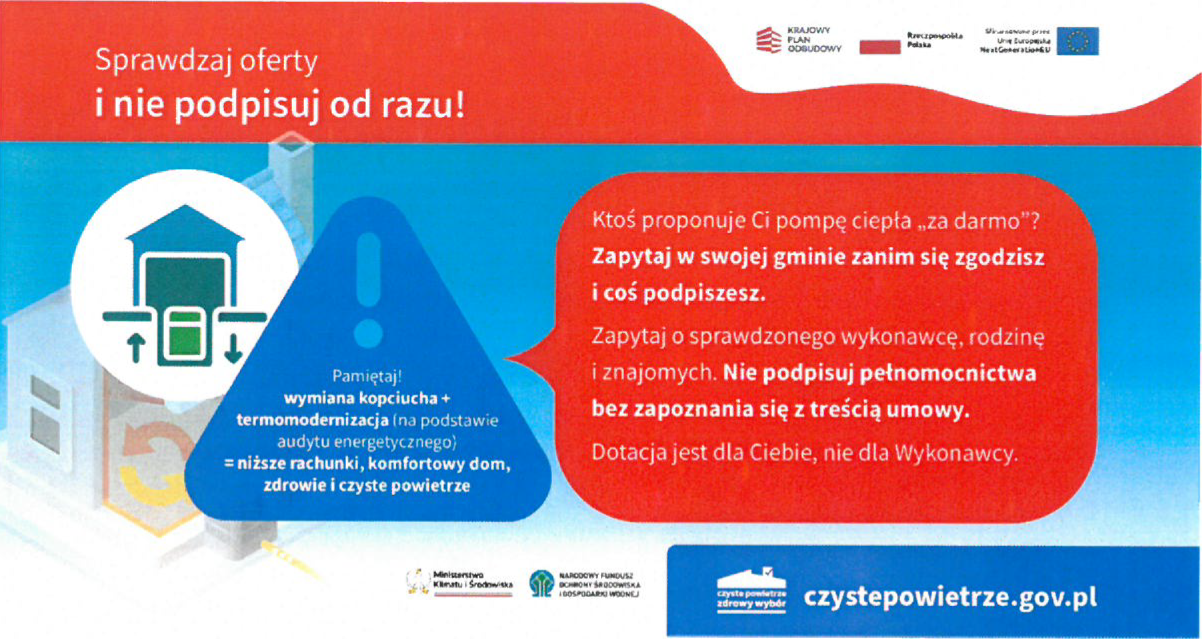 Jeśli jesteś wnioskodawcą lub beneficjentem dotacji z programu ,,Czyste Powietrze”, to bądź czujny rozważny w wyborze dostawcy i firmy instalacyjnej zajmującej się wymianą źródła ciepła. Szczególnie uważaj na tych, którzy pukają do Twoich drzwi i oferują coś ,,za darmo”. Niestety, zdarzają się na rynku usług nieuczciwi wykonawcy, którzy oferują usługi i produkty niskiej jakości oraz zawyżają ceny. Zwracamy uwagę, że wybór firmy sprzedającej urządzenie, jak i wykonującej jego montaż, należy do Państwa – naszych wnioskodawców i beneficjentów.